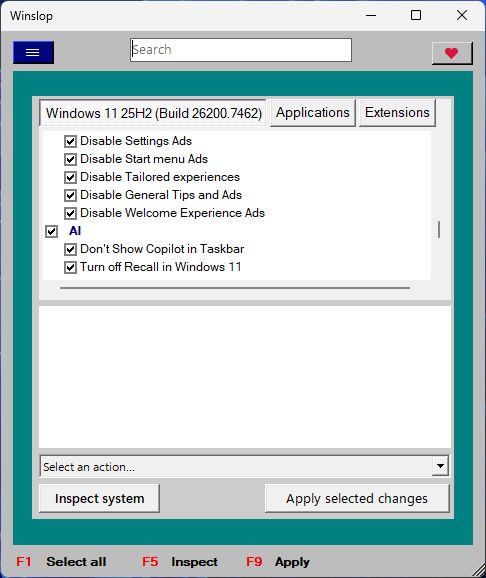 而这款新东西的名字极具意味(Slop意为“质量、马马虎虎的创做内容”)。帮帮用户脱节这些烦人的AI功能。无论用户能否喜好,但其不只能够移除AI功能,可谓无处不正在。一款名为Winslop的新东西应运而生,别的东西供给了还原选项,调整Windows的启动行为、现置及告白投放。现在,从文件办理器到各类系统功能,能够轻松恢复到原始形态。但将其为了一款原生的、模块化的图形界面使用。它还能通过点窜注册表和组策略,